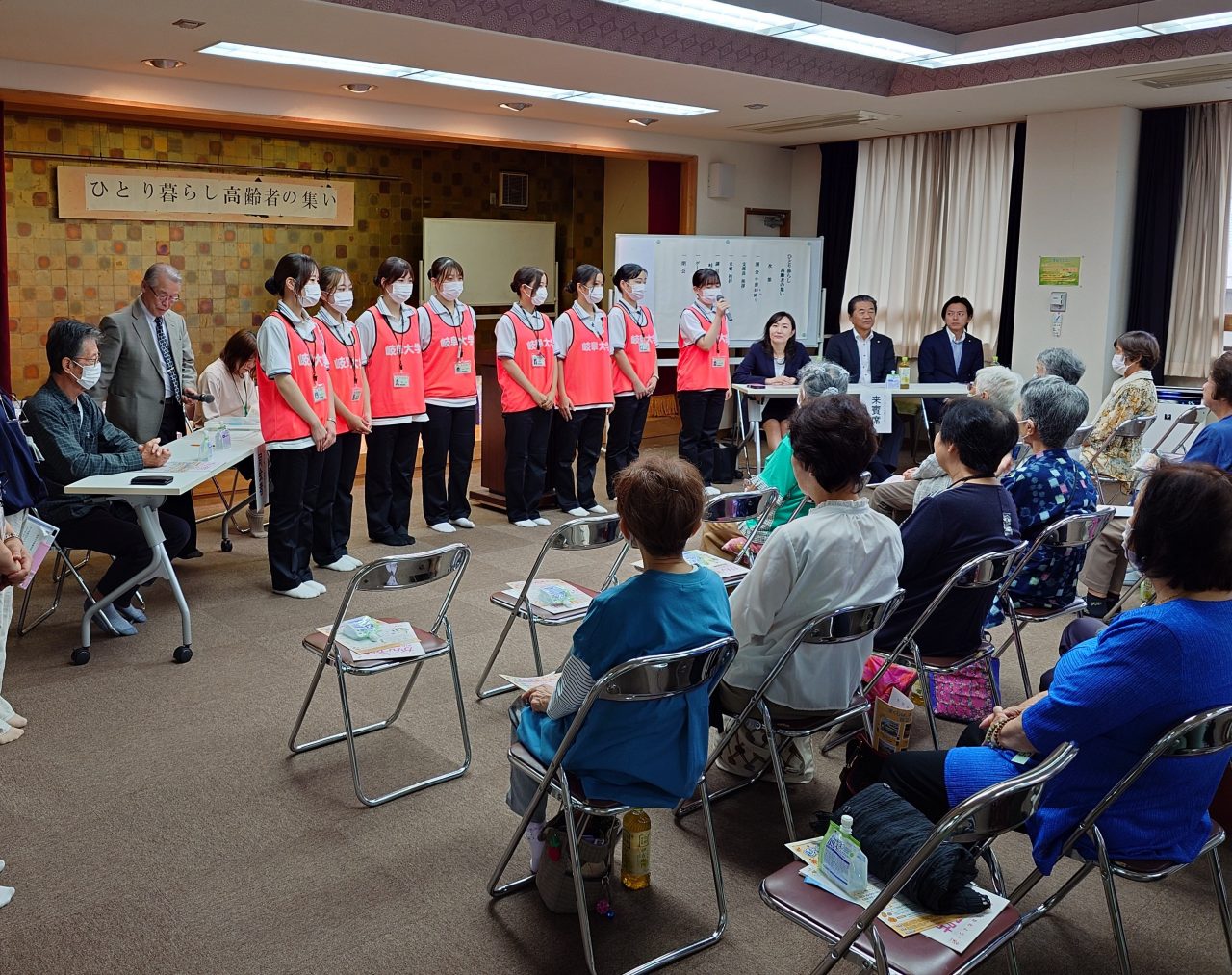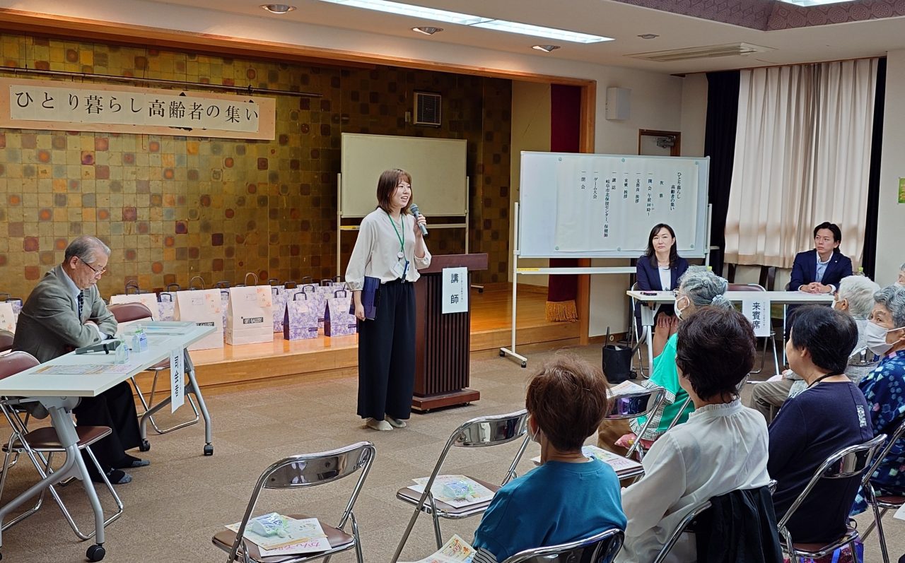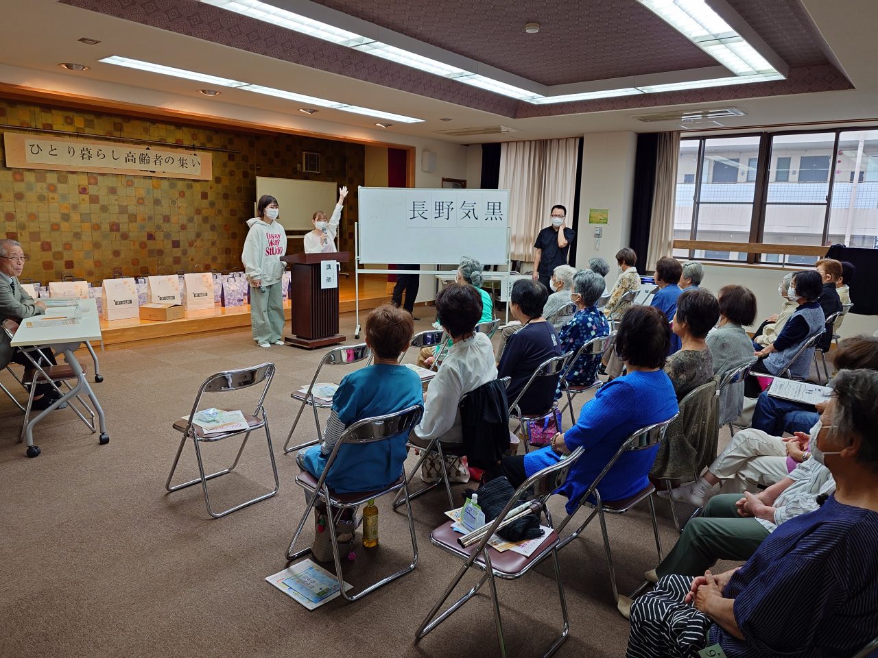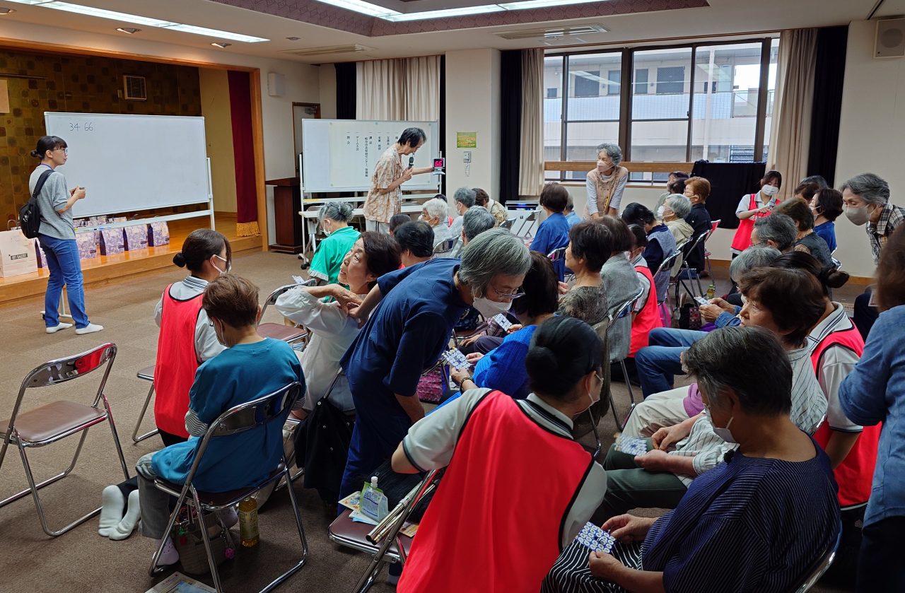10月4日㈯黒野会館において「ひとり暮らし高齢者の集い」が民生児童委員会と岐阜大学看護学科一年生方々の協力を得て開催されました。初めに岐阜市北保健センターの沼口保健師さんより健康寿命を延ばす、体と心の活力低下を防ぐ「フレイル予防」の健康講話があり、続いてあそか苑の吉村介護福祉士さん達より脳トレ漢字クイズで参加者さんが次々と回答され、楽しく行われました。最後に恒例のビンゴゲームで皆さんの大歓声で盛況に楽しいひと時をすごして頂きました。