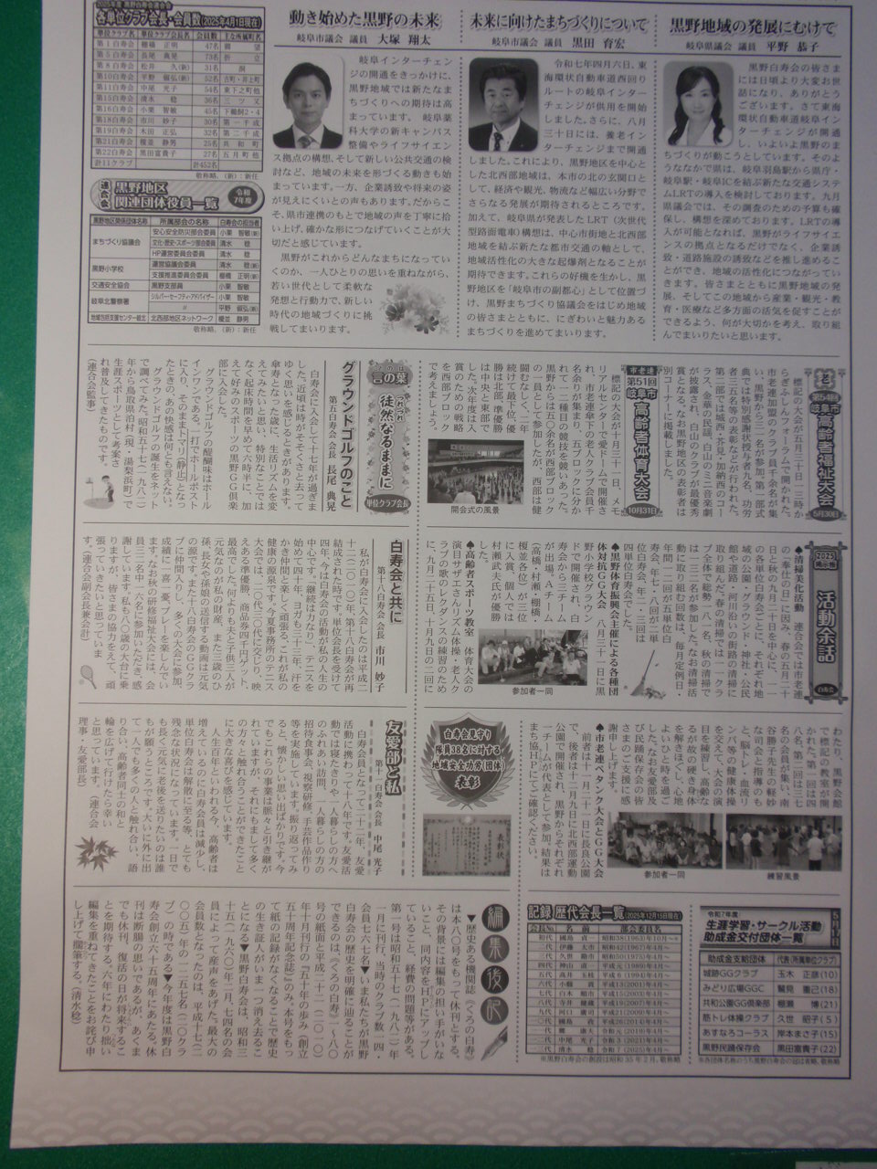 白寿会連合会が黒野に誕生して今年65周年を迎えた。その歴史を綴ってきたのが≪くろの白寿≫である。今年(2025年12月15日刊行)で第80号(年2回の刊行期がある)を数える。残念ながらこの号をもって、諸般の事情から休刊とする。断腸の思いであるが、復刊されることを期待したい。ここに歴史を紡いでこられた各号の編集者各位及び刊行をご支援いただいた会員各位に深甚なる謝意と御礼を申し上げる。さらば≪くろの白寿≫よ。写真は80号の1面と2面です。