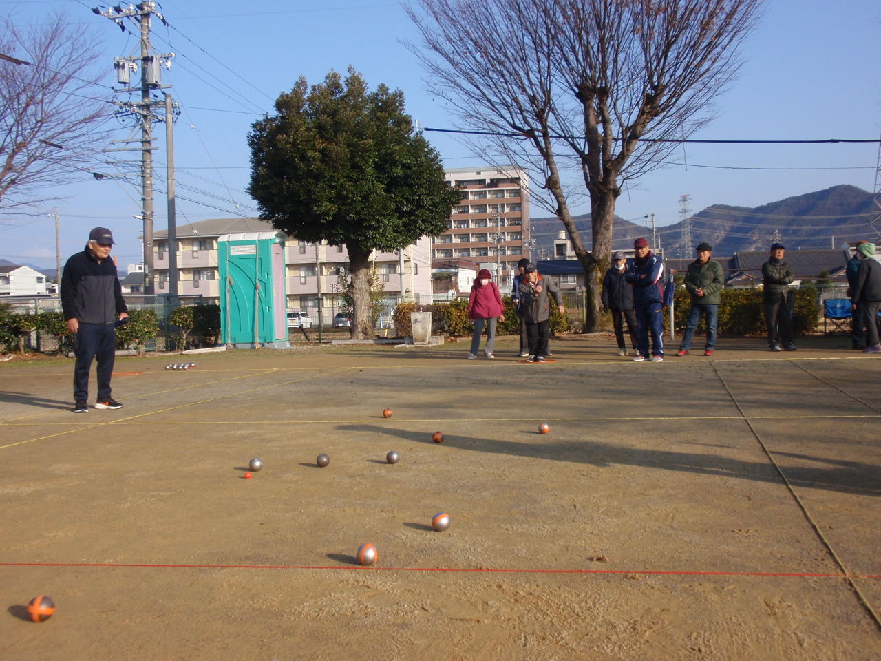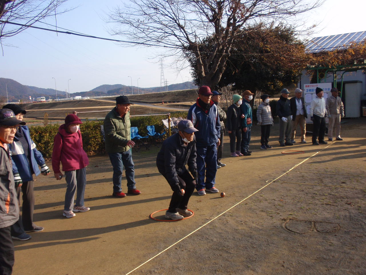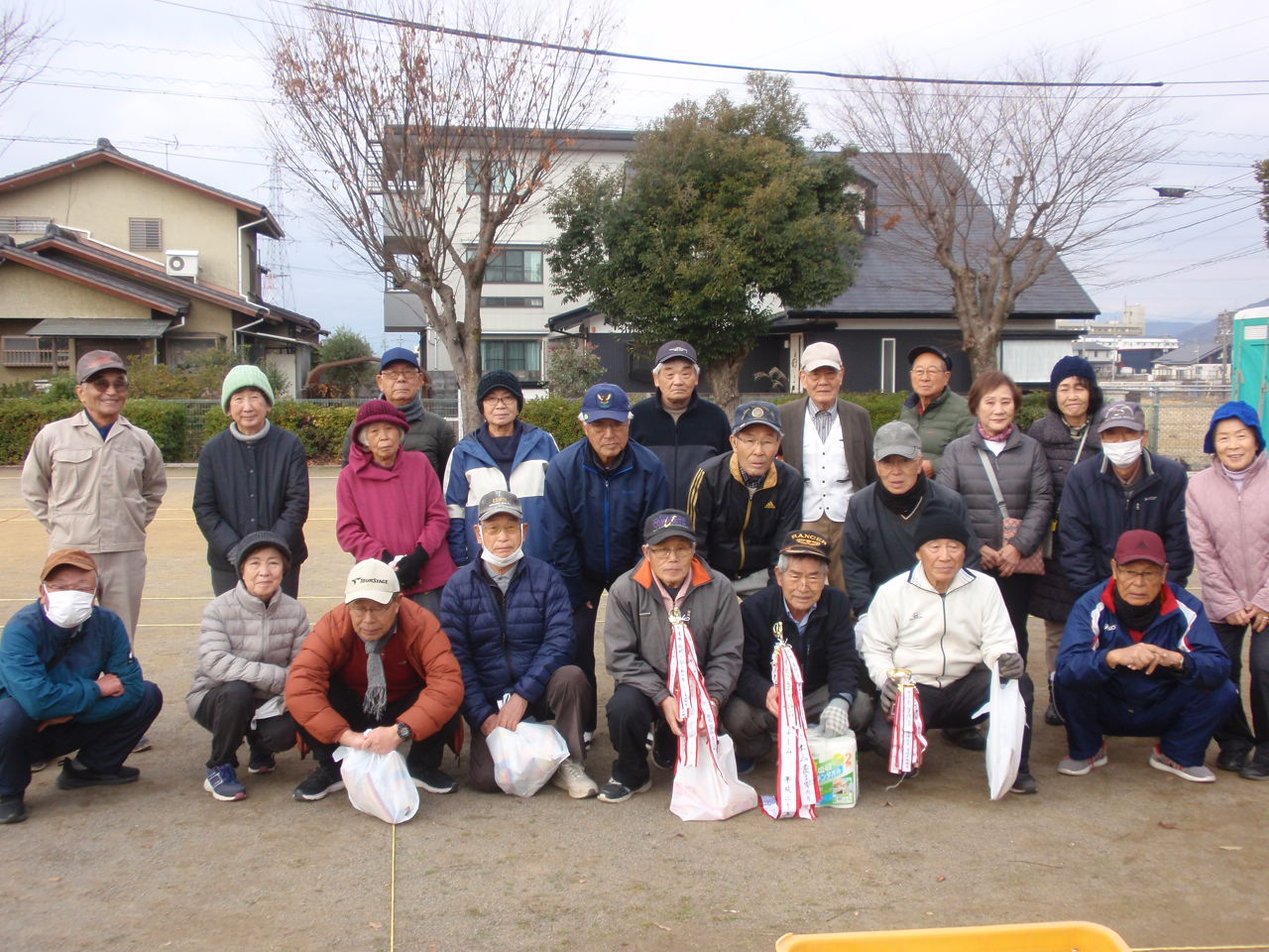 12月17日(水)8時半から共和公園で、標記の交流大会が開かれた。各地区から4チーム(3名1組)、計24名が参加し、トーナメント方式で競技を行ない、2時間にわたって熱戦を展開した。その結果、黒野B(清水・棚瀬・長尾各位)が優勝、黒野C(棚橋・松井・平野各位)が3位となった。写真は大会風景と参加者一同です。