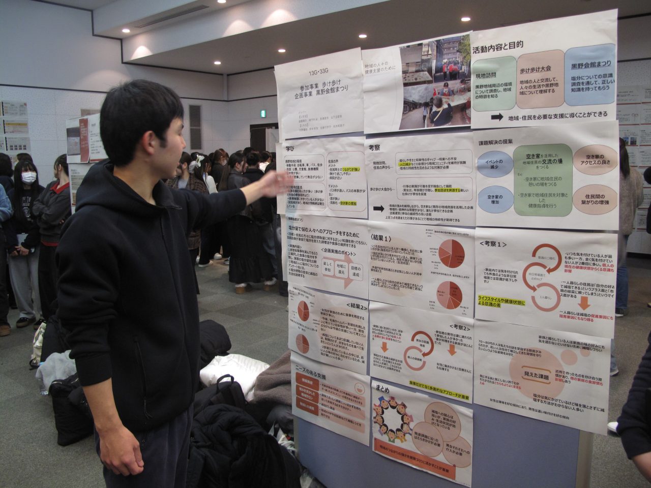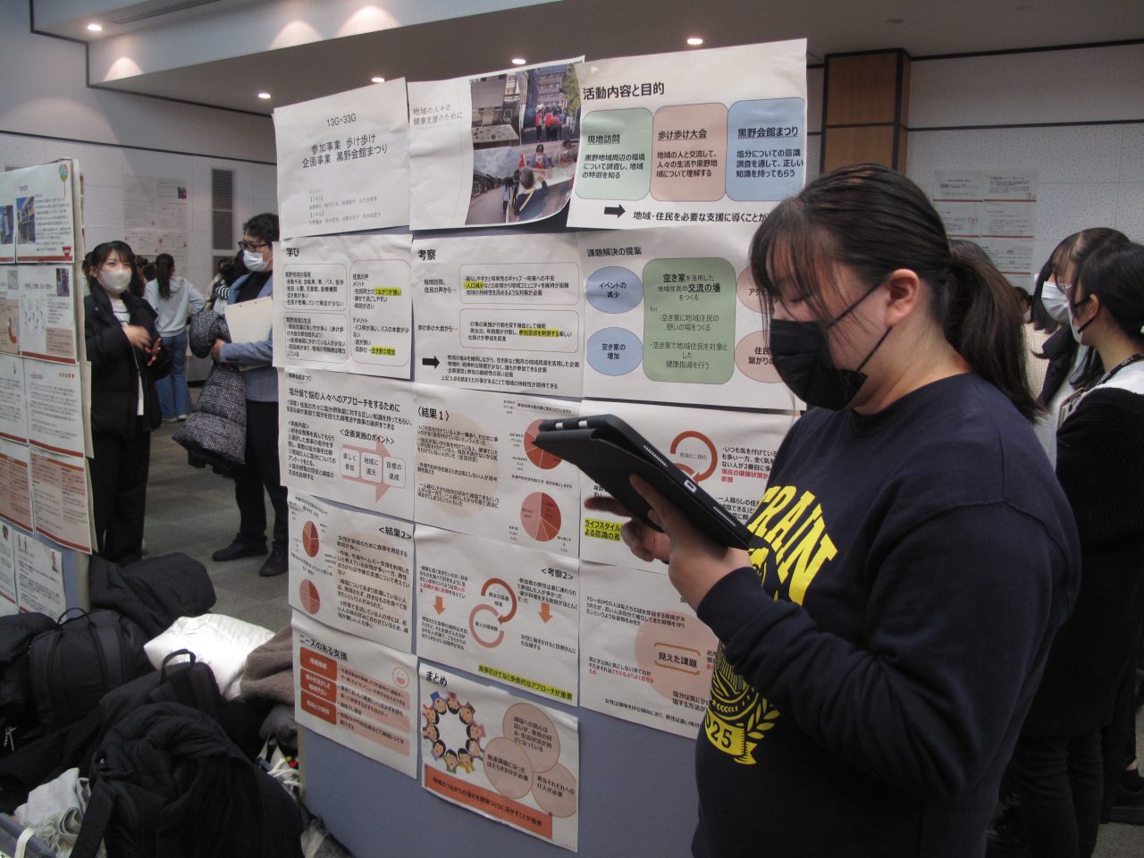岐阜大学看護学科との「黒野地域連携事業」の報告会が岐阜大学医学部において開催されました。発表はすべて紙上報告形式です。自分たちが参加した黒野での各種行事を資料としてまとめ紙上で報告・発表するものでした。活動の概要、観察や考察、参加者とのコミュニケーションなど、どの掲示物も幅広い観点から丁寧に分かりやすくまとめてあります。この事業において、私たちも若い学生と触れ合うことで元気をもらい、学生もまた人々と共に活動することで、多くのことを感じ取ってくれたのではないかと思います。